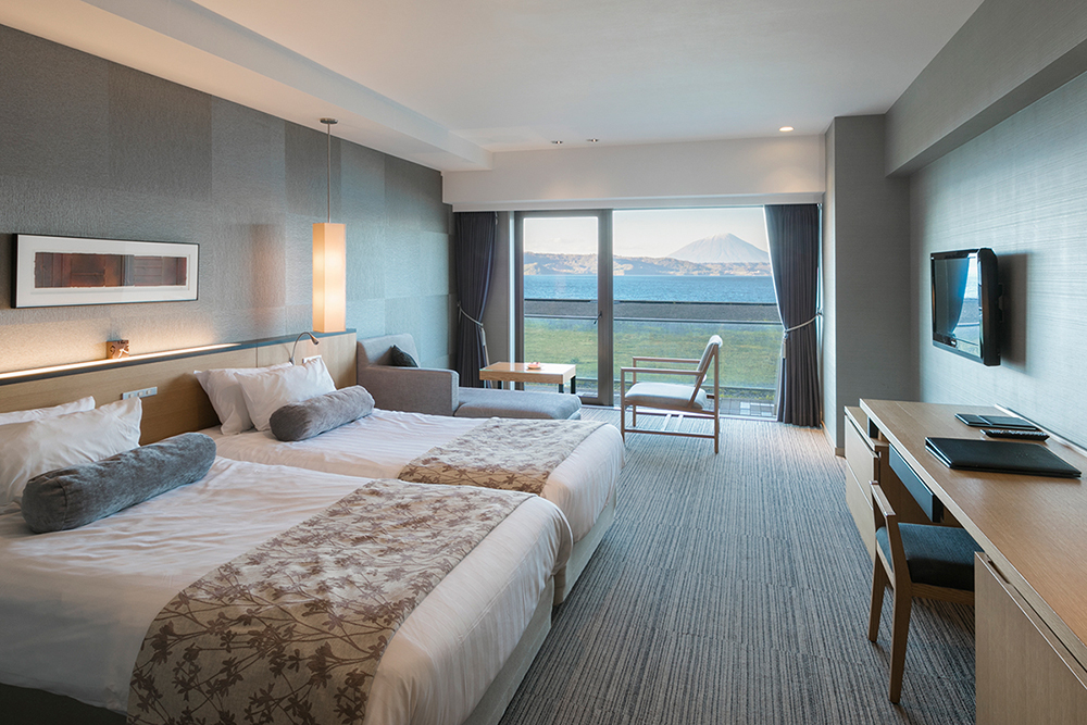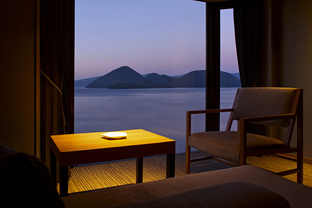 お二人でも余裕の36平米の洋室。窓辺のソファに座り、床から続く一面の窓から、洞爺湖や中島、羊蹄山の雄姿を一望できます。落ち着いたトーンや上品なライティング遣いなど、洗練された空間でありながら、快適にお過ごしいただけます。