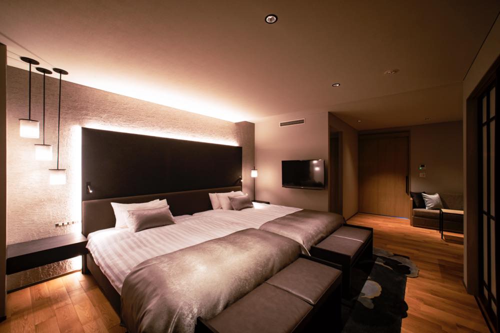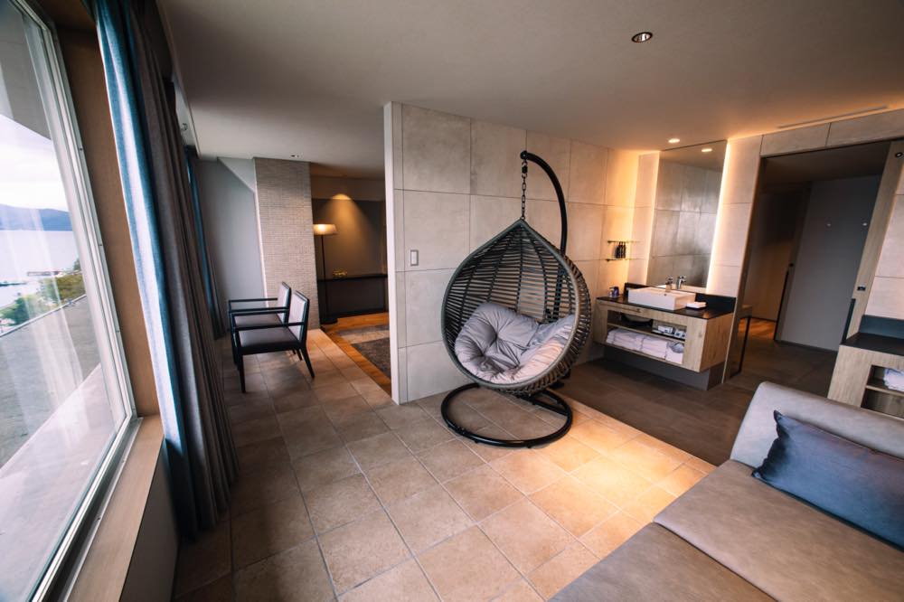 レイクビューの窓辺で時間を忘れる、究極の安らぎを 開放感あふれるサンルームを備え付けた、贅沢な112平米のスイートルームです。 雄大な洞爺湖を望む窓辺のハンギングチェアに身体を預け、ゆったり揺られて、日常の緊張感から開放されるひと時をお過ごしください。 レイクビューの窓から差し込む心地よい陽の光を感じながら過ごせるのも魅力です。 スタイリッシュな間接照明の、やさしく、暖かい光に包まれたベッドルームでは、最上のまどろみを知ることができます。