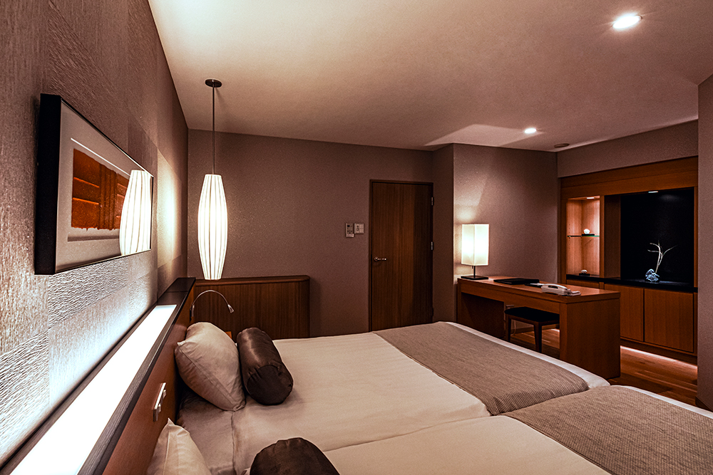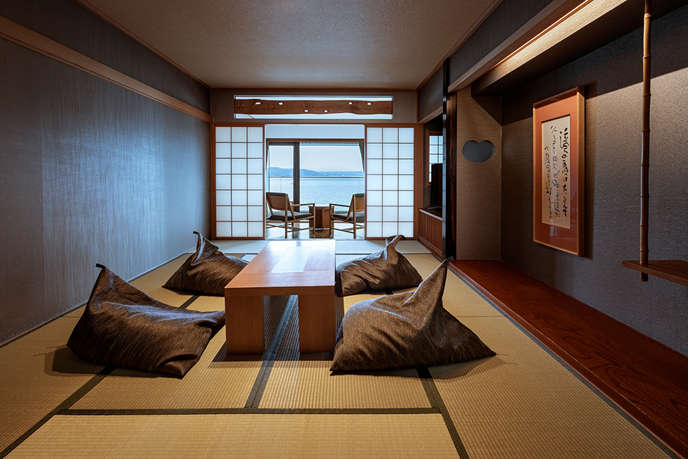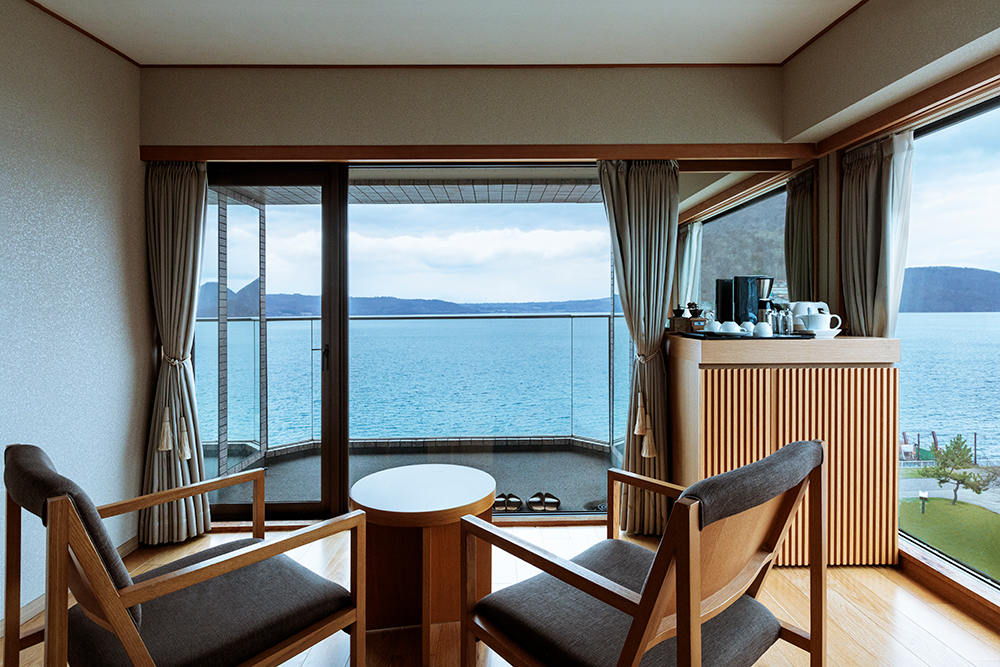 テラス付きのリビングルームと寝室に分かれた特別室は、広さ68平米。テラスの窓を開けると湖の風を感じられ、大自然にとけこむことができるのが魅力です。こだわりのオーダーメードクッションを配したリビングは和室、ツインベッドを設置した寝室は洋室と、異なるくつろぎを感じていただける和洋室タイプです。