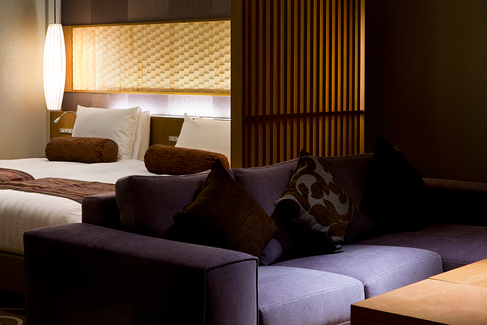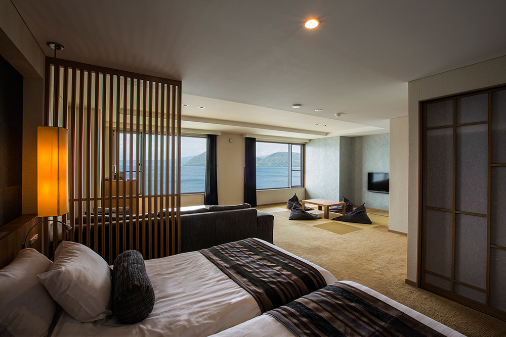 優しい陽に包まれながら時のうつろいを感じられる和の空間 56平米の広さがある開放的な和洋室タイプの客室。落ち着いた和の設えが心地よい空間です。 横に大きく広がる窓からは、柔らかな日差しがそそぎます。 琉球畳のくつろぎスペースや大きめのソファで、洞爺湖の景色を愉しみながらごゆっくりお過ごしください。