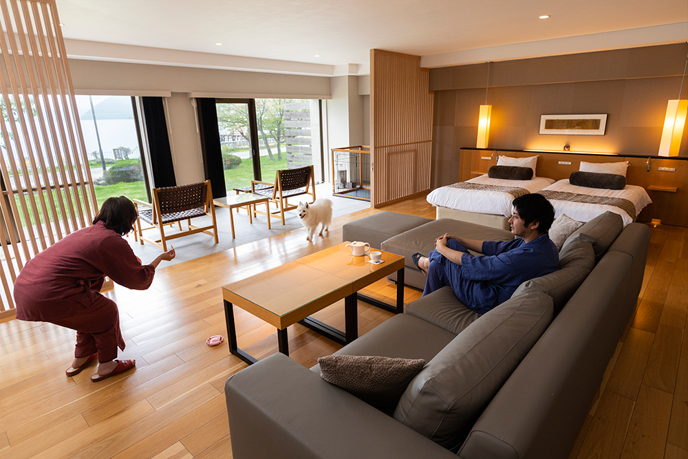 ワンちゃんと一緒に贅沢な時間を過ごせる、72平米のデラックスタイプ。ソファセットやツインベッドを配してもなおゆとりを感じられ、どこにいても洞爺湖の大自然を感じられる開放感あふれるお部屋です。ワンちゃん専用のシャワー設備やゲージもございます。