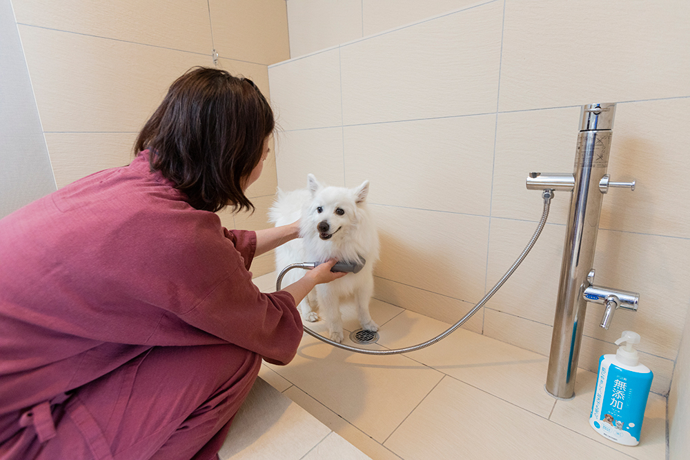 ワンちゃん専用のシャワー設備は、大型犬でも使いやすい大きめの造り。