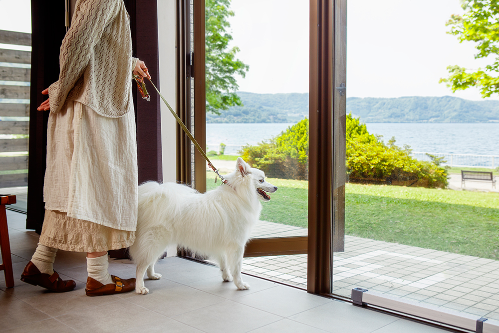 ワンちゃんもストレスなく過ごせる開放的な空間。テラスから出入り自由。
