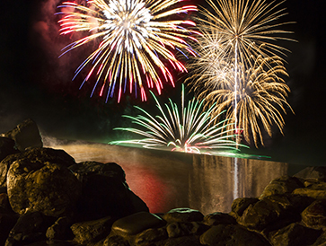 屋外で感じる迫力の花火と、湖面に反射する鮮やかな彩り。